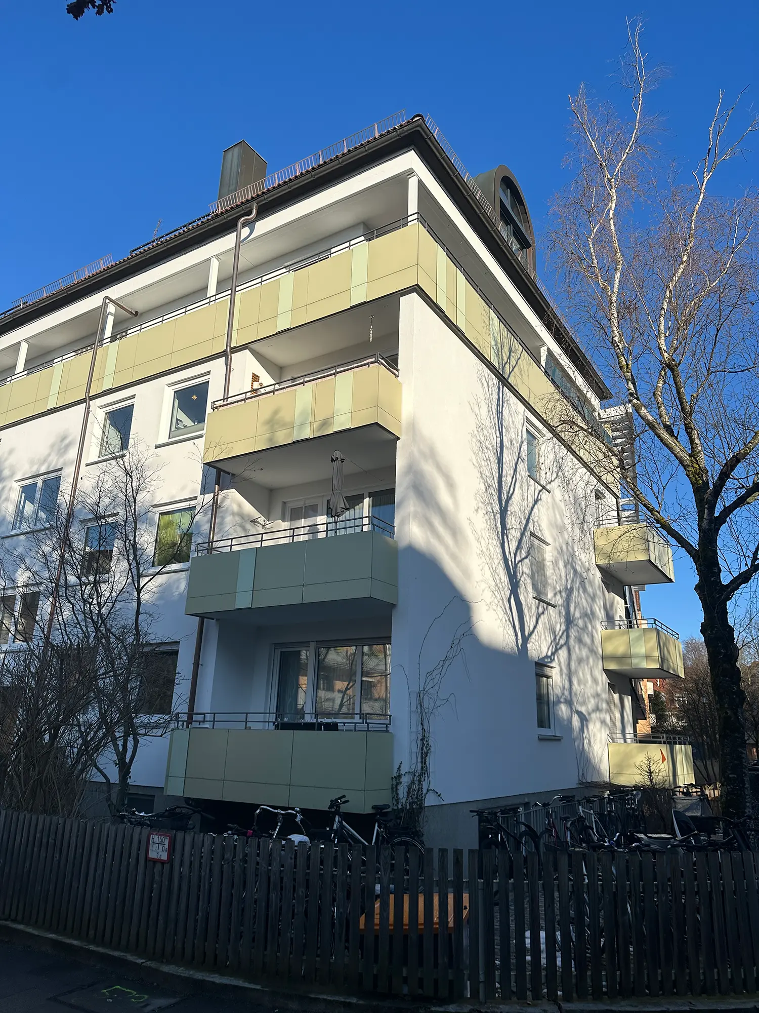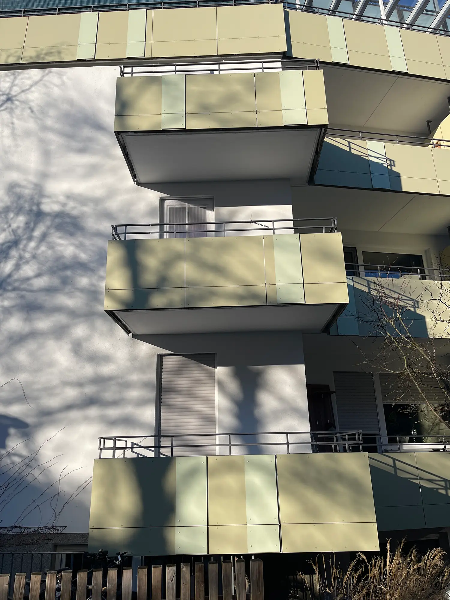 Die Balkone eines Gebäudes aus den 1970er-Jahren in der Brunecker Straße befanden sich in einem stark baufälligen Zustand. Nach einer statischen Überprüfung stellte sich heraus, dass die bestehenden Brüstungen aus Stahlbeton nicht mehr tragfähig waren und durch eine Stahlkonstruktion ersetzt werden mussten.
